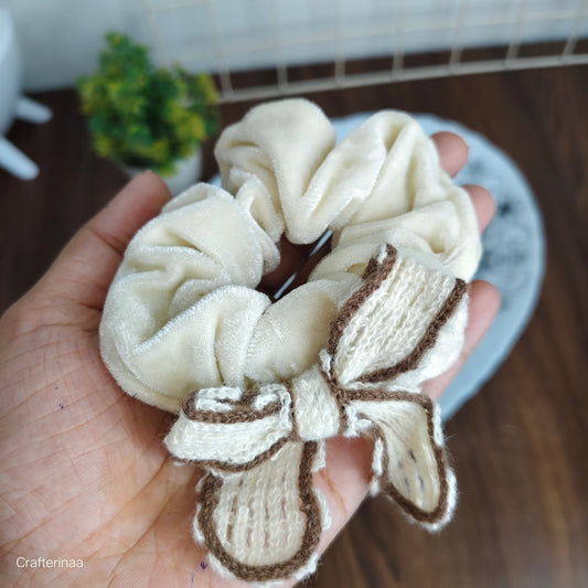 "Velvet Bow Scrunchies Set with woolen bow – Soft Hair Ties with Knitted Ribbon"