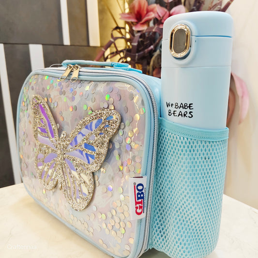 3D Butterfly Lunch Bag for Girls – Shiny Sequin Holographic Finish (bottle not included)