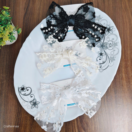 Vintage Style Lace Hair Bows|Big Bow Clips with Pearls