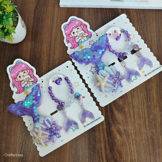Ocean Theme Hair Clips & Bracelet Set – Mermaid Tail, Shell & Starfish Design