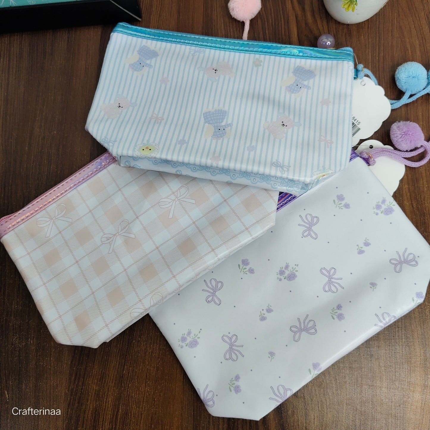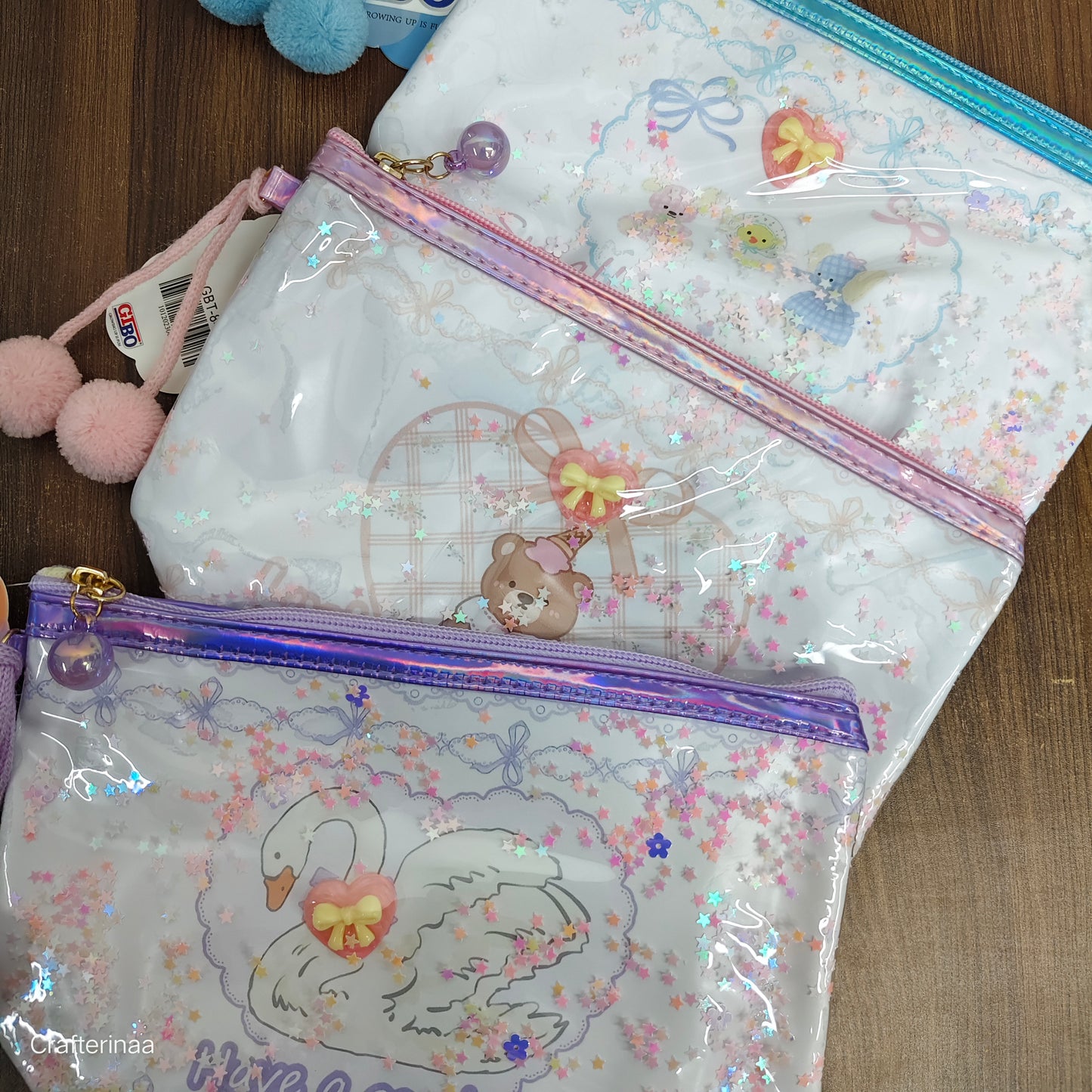 "Glitter Transparent Zipper Pouch – Cute Cartoon Print with Pom Pom Charm"